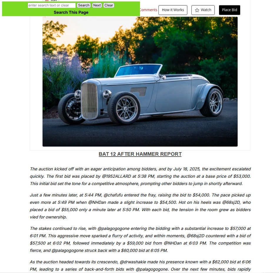 Bat 12 After Hammer narrates the live auction bidding action as it occurred in real time. Every bid, its impact on the action and the intensity of the back and forth to the close are all covered in a final readout. With hundreds of daily live auctions recapped in a 100% searchable daily webzine. Never miss a bidding war!